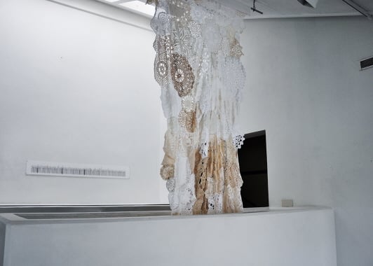 Jag tar det individuella arbetet och gör det kollektivt, både i tanke och rent konkret. Jag köpte kasserade virkade dukar på second hand. De som säljs för 10 och 20 kronor men som i arbete är värda så mycket mer. Dessa har jag sedan sytt ihop, med bara nål och tråd, för att skapa en stor, nästan skulptural installation, av virkade dukar som faller från taket ner i de öppna ”lådorna".