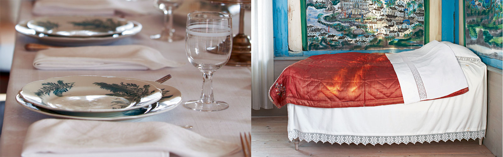 När det dukades till fest i Hälsingland på 1800-talet blev det tillfälle att visa vad gården förmådde. Vid sidan av ett dignande matbord plockades även husets vackra textilier fram. På de skurade trägolven låg trasmattor i kraftiga färger. I ”storsängen” lades lager av broderade linnelakan, täcken och örngott. På borden rullades långa dukar ut och i fönstren hängdes tunna, vita gardiner. Tillsammans med väggarnas målningar och tapeter skapades den exklusiva men ombonade känslan av fest och överflöd.