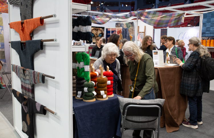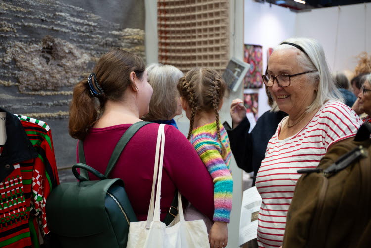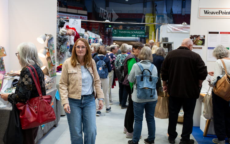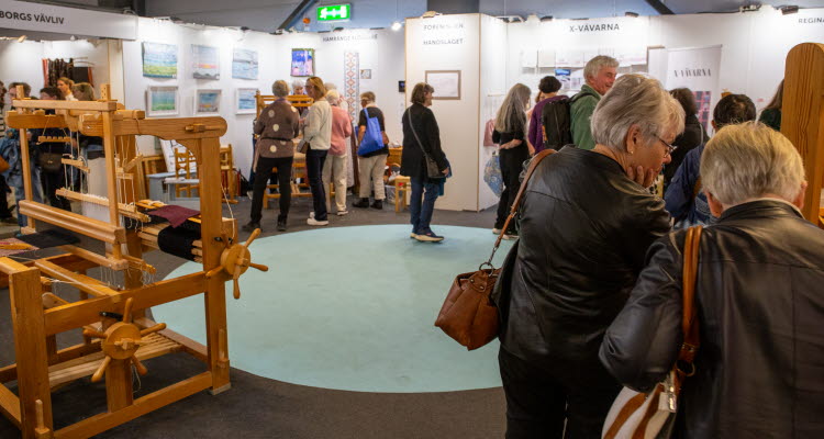 Många besökare samlade i området "VÄVTORGET", där vävda textilier och dukningar visas upp i olika montrar.
