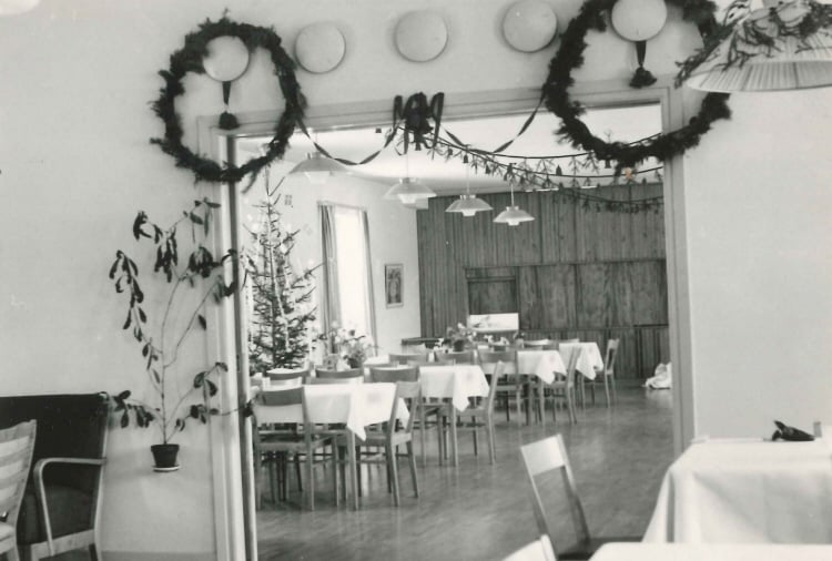 Månadens fotografi föreställer en jul på lasarettet vid mitten av förra seklet. Så här såg det ut i personalens matsal och samlingsrum när man pyntat inför personalens jullunch. Doktor Sjöberg var känd för att älska julen. Han kom till lasarettet från Hudiksvall där han varit förste underläkare. I grund och botten var han skåning som talade bred skånska. Då han anlände till Bollnäs sa disponent Lindström till honom ”nu får förbanne mig doktorn tala svenska så vi förstår honom!”. Då svarade Sjöberg ”då fordrar jag att även mina patienter talar svenska”.