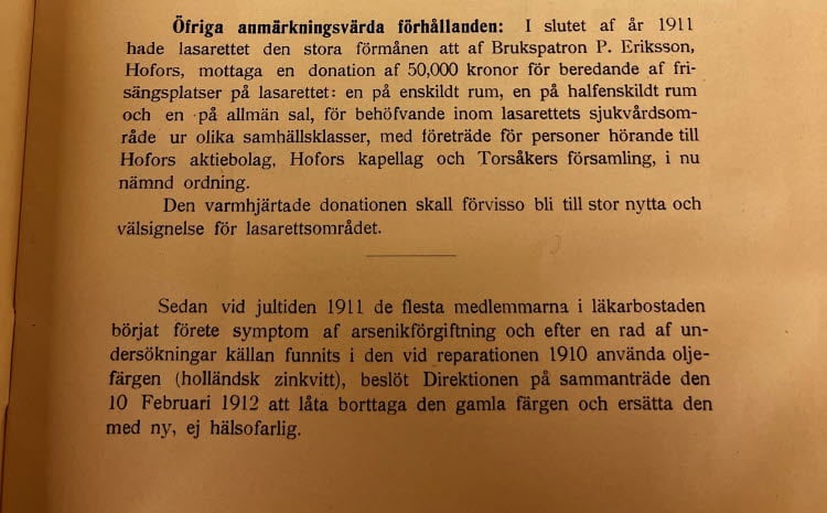 Innan Helga lämnade lasarettet kan hon ha varit inblandad i en förgiftningsincident. Gefle lasaretts årsberättelse från 1912 berättar om hur de boende i den så kallade läkarbostaden började uppvisa symtom på arsenikförgiftning omkring juletid 1911. Det är oklart om man med ”läkarbostaden” menar den gamla läkarvillan Carlsborg som Regionarkivet tidigare berättat om i Månadens fotografi från sommaren 2023, eller någon annan byggnad på sjukhusområdet tillägnad underläkarna. Det är även oklart om Helga bodde på sjukhusområdet vid den här tiden. Av årsberättelsen framgår att de boende blivit arsenikförgiftade av hälsofarlig målarfärg.