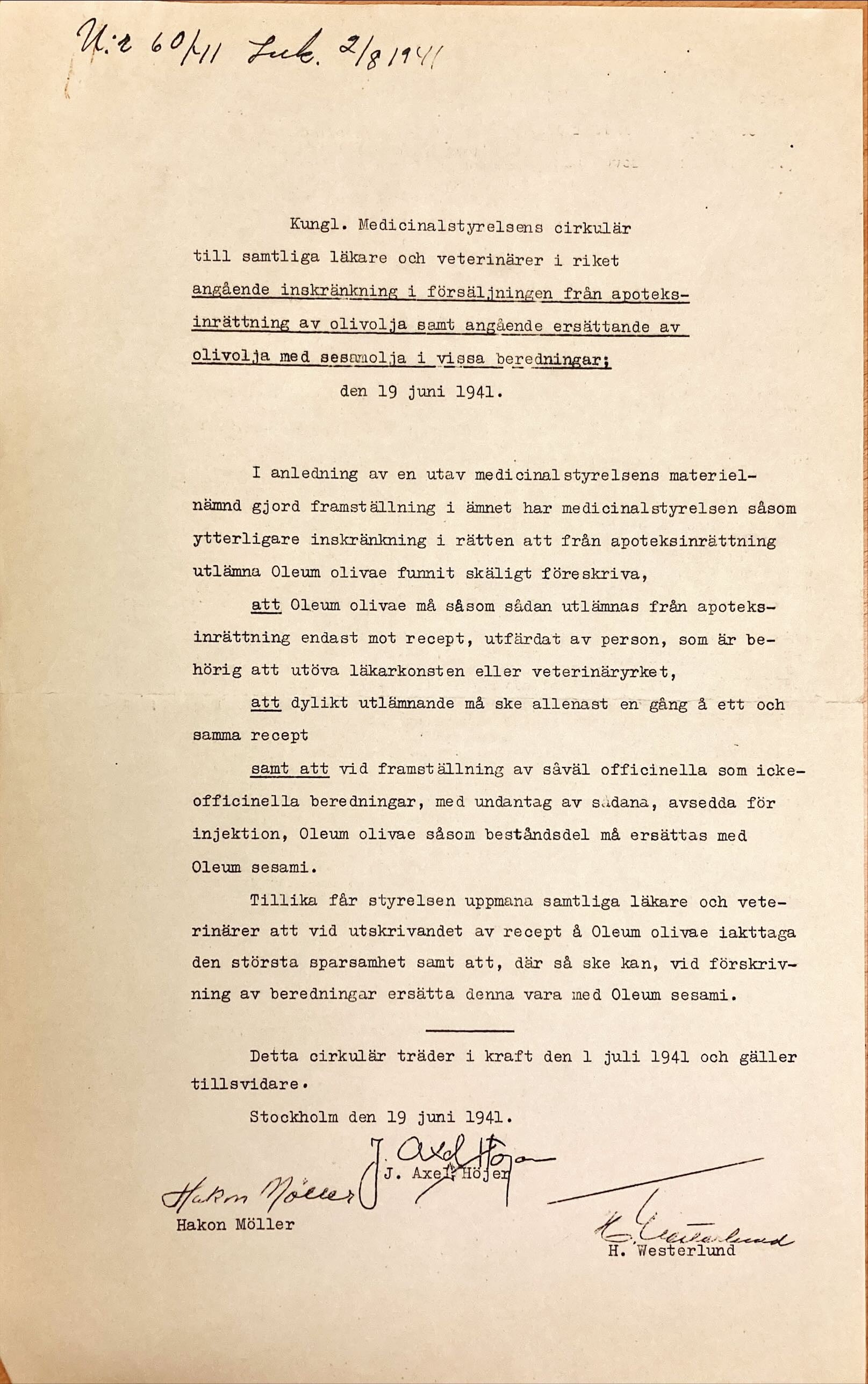 Det är mitten på juni under andra världskriget och ransoneringen på matvaror är hård. Det som vi idag ser som en vanlig matvara – olivolja – var under 1940-talets Sverige något som skrevs ut på recept av läkare och såldes på apotek. I det krigshärjade Europa uppstod brist på detta medikament, vilket fick Kungliga medicinalstyrelsen att utkomma med direktiv till alla ”läkare och veterinärer i riket”. Så även till herr provinsialläkare Synnergren i Alfta.