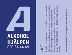 Kontaktkort (i buntar om 30 kort) med kontaktuppgifter till Alkoholhjälpen.