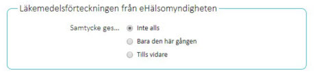 8. Under rutan för samtycke till sammanhållning journalföring finns en ruta för samtycke till läkemedelsförteckningen från e-Hälsomyndigheten. Detta samtycke kan inte inhämtas för hela enheten utan kan bara inhämtas av dig. Vilken typ av samtycke du kan inhämta beror på din profession och om du har förskrivningsrätt. Har du inte inhämtat detta samtycke väljer du Samtycke ges inte alls. Läkemedelsförteckningen är då inaktiverad och går inte att läsa när du går vidare till sammanhållen journalföring.
