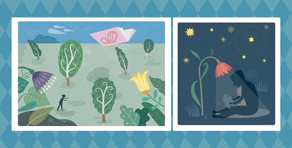 har gjort illustrationerna i häftet. Så här förklarar hon själv tankarna bakom illustrationerna; ”Blommorna får symbolisera själva läsandet och , bokens förmåga att uppmuntra fantasi, empati och språkglädje.